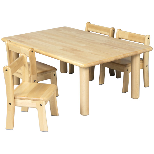 ※こちらの商品は、ラッピングにご対応できません。ご了承願います。【角テーブル 90×60 丸脚】幼稚園・保育園にオススメなブロック社の木製子ども家具。耐久性が優れていて 表面は汚れや傷がつきにくいテーブルです。厚み2.5cmあるしっかりとした天板に、ブナ材の太い脚がついたテーブルです。【乳児椅子・幼児椅子】乳児椅子・幼児椅子は、足から背もたれのカーブやサイズによって座面の奥行きを変えるなど子どもが快適に座れるようなデザインになっています。椅子の脚底には、オリジナルのパットが付いていますので、床を傷つけません。※テーブルの組み立ては、天板に脚を取り付けるだけとなります。※イスは完成品でお届けいたします。○対象年齢:4歳○サイズ:テーブル/W90