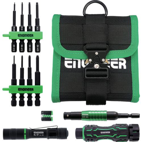 《メーカー》 (株)エンジニア 《品番》 DXZ-43 《特長》 ●なめた六角穴付ボルトを救出できるモバイルツールセットです。 ●DZ-80/精密な操作性とパワフルな回転力を生む、多機能なドライバーグリップです。 ●DH-402/家具や家電の組み立て、修理に便利なヘックスビットの4本セットです。 ●DBZ-402/潰れた六角穴付ボルトを叩かず外せるネジモグラ ミドルの4本セットです。 ●DR-25/コーナーや壁際のネジもはずせるジョイント付きエクステンションです。 ●DR-29/強力マグネットでネジを落とさず確実に保持できる極短サイズのネジキャッチです。 ●SL-97/ポケットサイズでしっかり照らせる、超小型のフラッシュライトです。 ●KSE-36/実用性と携帯性に優れたスタイリッシュツールケースです。 《用途》 ●潰れた六角穴付ボルトの取り外しに。 ●狭く奥まった場所、コーナーや壁際での作業に。 ●工場や現場での修理、整備に。 ●その他、設備機器、自動車、バイク、自転車、農機具、船舶、スポーツ用品のメンテナンス、日曜大工にも。 《仕様》 ●差込角(mm):6.35 ●適合サイズ:対辺