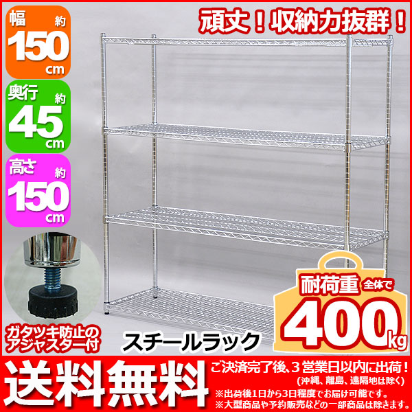 専用キャスターはこちらをクリック!>>>サイズ違いはこちらをクリック!>>>■商品について一言説明スチールラック4段は、幅150cm 奥行き45cm 高さ150cmの多目的ラックです。■特徴、機能・頑丈で収納力抜群!耐荷重400kg(棚板1枚200kg)のしっかり設計だから、重い物を乗せても大丈夫!・簡単に短時間で組み立てが可能(簡易組立)です。・スチール製なのでお手入れも簡単♪・棚板はお好みの高さに調節可能な可動棚です。■サイズ外寸:幅150cm 奥行き45cm 高さ150cm内寸:幅143cm 奥行き38cm■重量約26.8kg■耐荷重平面耐荷重棚板:約200kg全体:約400kgまで■色メッキ(クロームメッキ)■組立についてお客様組み立て家具※短時間で簡単に組み立てが可能(簡易組立)です。■送料全品送料無料♪(送料0円!)(沖縄県、離島などの一部地域は別途お見積りいたします)
