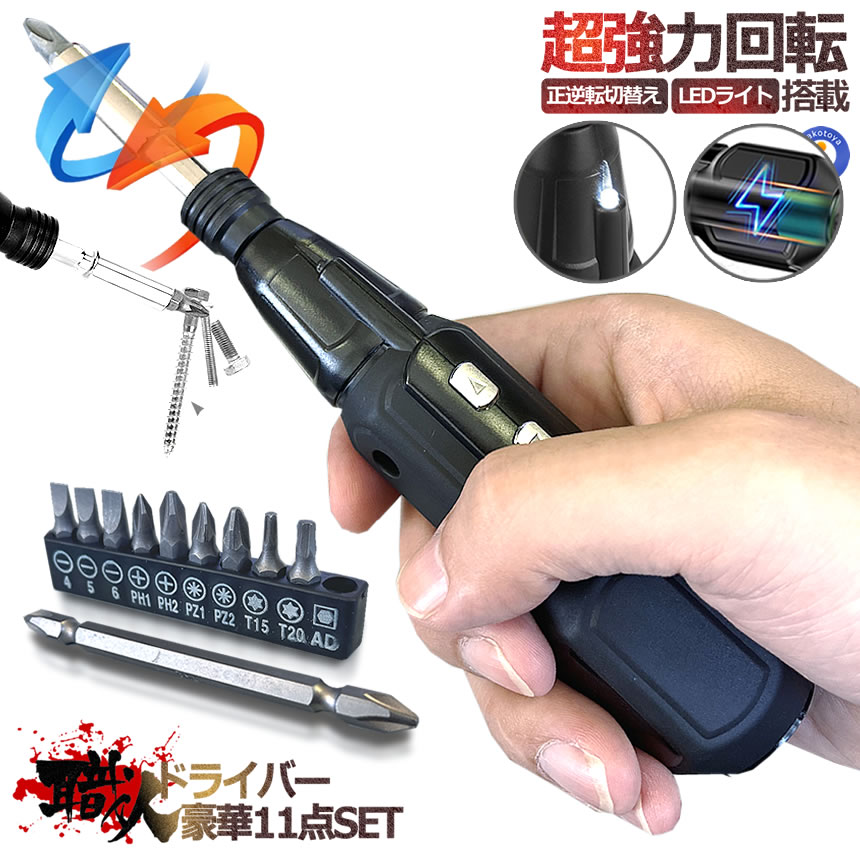 使い易い-このドライバーは電動だけでなく手動操作もできます。双方向回転ボタンを押すだけで起動できネジに関する作業に最適です。効率的なDIY家具の組み立てなどのための電動ドライバーです。実用デザイン-ドライバーの前にLEDライトが付いて暗いところで作業してもすぐ見える体積が小さく、パソコン、家具、DIY手作りなどのような狭い所での作業に最適です。小さくても強力-この小型電動ドライバーは男子にも女子にも最適です。回転速度:280RPM。自動/手動モード。トルク:2/10N・m。家庭DIYなどの小型作業に対してはもう十分!USB充電-USB充電の電動ドライバーですからバッテリー交換の必要はなくリチャージ可能です。球体の柄は腕にピッタリ!長時間作業を行っても疲れません。本州/四国/九州は送料無料(北海道+250円、離島/沖縄+650円での発送となります。)
