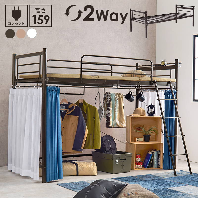 ■ロフトベッド ミドルタイプ 高さ159cm カーテンが取り付けられるロフトベッド 2way 宮棚 コンセント付き