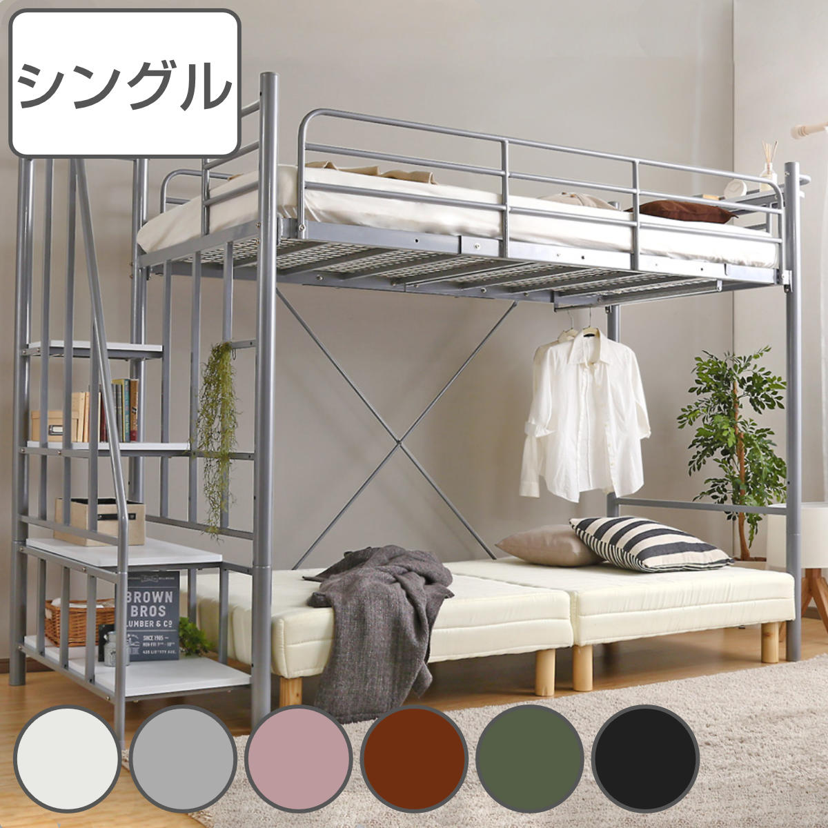 ■ロフトベッド 階段付き コンセント付き シングル S システムベット 収納付き ラック棚付き 宮棚 耐荷重150kg 高さ170cm スチール 耐震 北