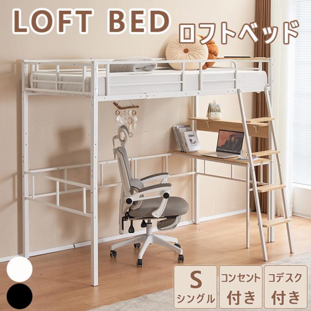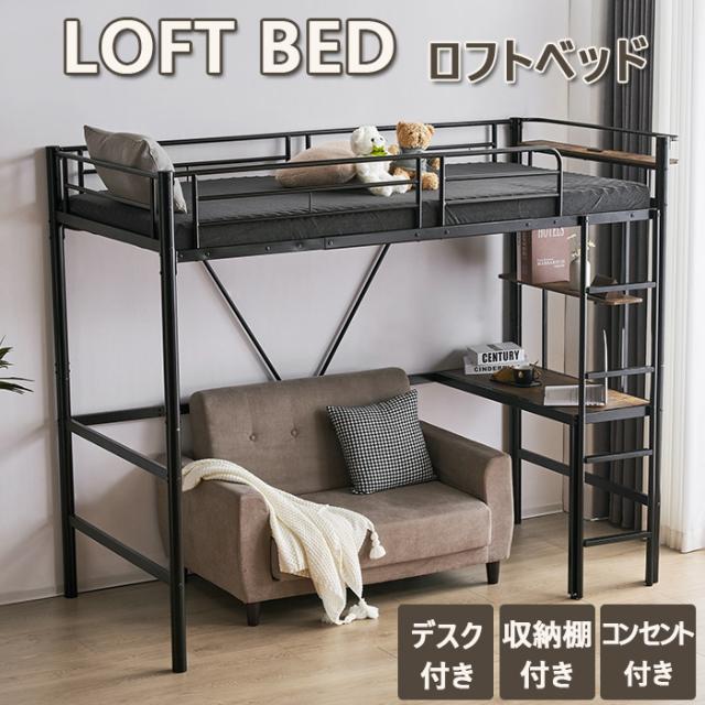 ■ロフトベッド パイプベッド 耐震ベッド シングル デスク付き コンセント付き 耐荷重150kg 収納棚 高さ170cm 子供ベッド 子供部屋
