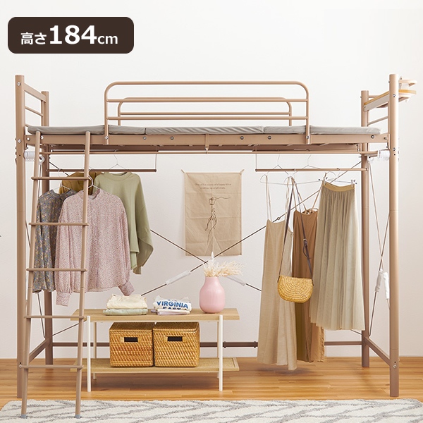 ■ロフトベッド ハイタイプ 高さ184 シングル 宮付き おしゃれ 可愛い パイプベッド ハンガー付き ベッドフレーム コンセント 棚 キャメル