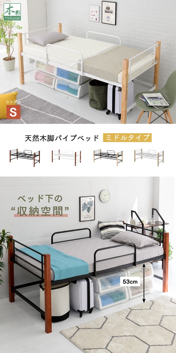■天然木脚 ミドルベッド シングル パイプベッド 高さ 96 長さ 209 木製 ロフトベッド ロータイプ 天然木 頑丈 丈夫 有効活用 新生活 極太