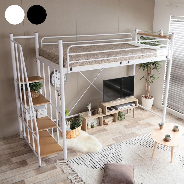 ■ロフトベッド シングル 階段 棚コンセント付き パイプベッド コンパクト ベッドフレーム 北欧 おしゃれ ロータイプ ハイタイプ ミドル 宮