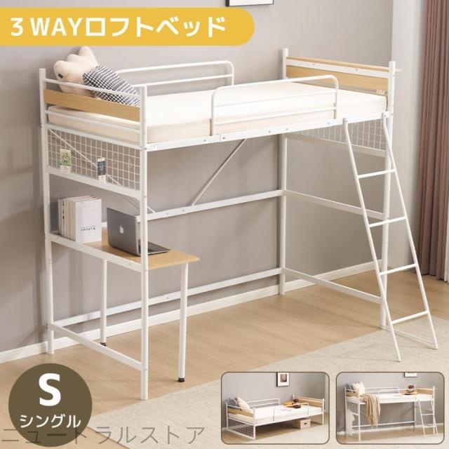 ニュ3WAY ロフトベッド システムベット 耐震ベッド パイプベッド デスク付き・移動可能 コンセント付き メッシュパネル付き 高さ3段階 Sシングルベット スチール 省スペース 子供部屋 二段ベッド 子供 大人用 北欧風 新生活応援