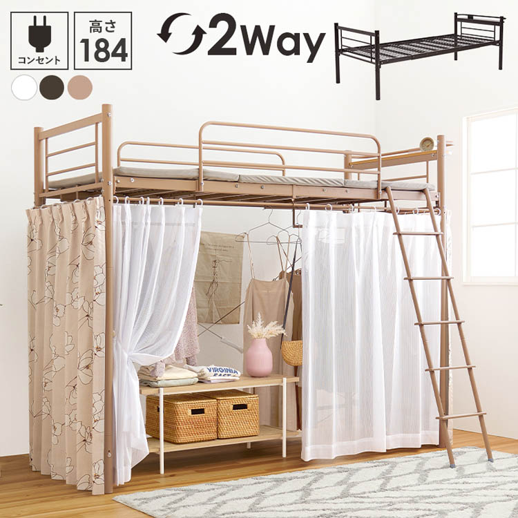 ■ロフトベッド シングル ロータイプ カーテン取付可能 2口コンセント付 2WAY ( ベッド 低め カーテンレール付 コンセント付 シングルベッ