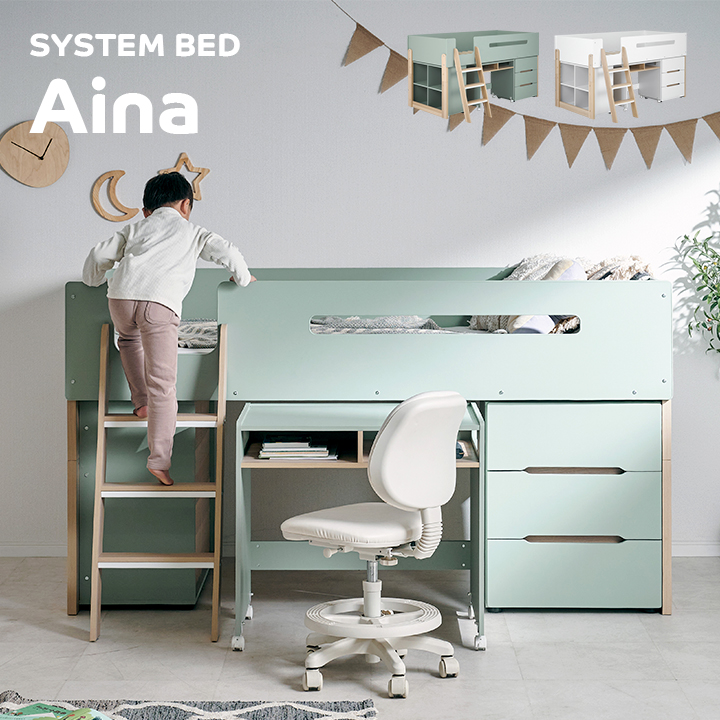 ■システムベッド Aina(アイナ) 2色対応 ロフトベッド デスク付き 子供 大人 ロータイプ システムデスク 学習机 学習デスク コンパクト 分