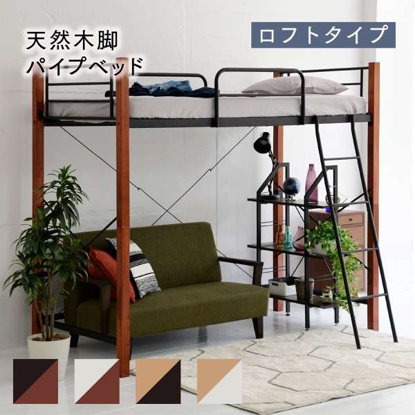 ■天然木脚 ミドルベッド シングル パイプベッド 高さ 96 長さ 209 木製 ロフトベッド ロータイプ 天然木 頑丈 丈夫 有効活用 新生活 極太