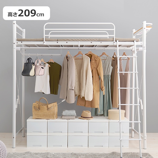 ■ロフトベッド スパーハイ 高さ209 シングル 宮付き おしゃれ 可愛い パイプベッド ハンガー付き ベッドフレーム コンセント 棚 ホワイト