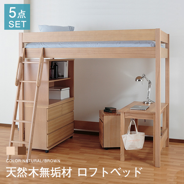 【商品説明】・システムベッドシリーズの5点セット!充実の基本セット。・この1セットで勉強スペース・収納・寝室の機能が揃います。・天然木を贅沢に使用、組み換えできるのでお子様の成長や生活環境に合わせてお使いいただけます。・ベッドの脚柱には6cm角の立派な天然木無垢材を通し、グラつかないガッチリフレームを実現。【商品名】リーブル セット4【サイズ】ロフトベッド:幅107×長さ210×高さ180(床面高150)cmデスク[幅95cm]:幅95×奥行55×高さ70cmデスクワゴン:幅41×奥行43×高さ56cmシェルフ[幅100cm]:幅100×奥行40×高さ70cmチェスト[幅100cm]:幅100×奥行40×高さ70cm【仕様】ベッド:タモ天然木無垢材、タモ天然木突板(ウレタン塗装)デスク:タモ天然木無垢材(ウレタン塗装)、桐天然木無垢材、桐天然木化粧合板デスクワゴン:タモ天然木突板(ウレタン塗装)チェスト:天然木化粧合板(天板・前板)プリント化粧合板(側板)シェルフ:プリント化粧合板