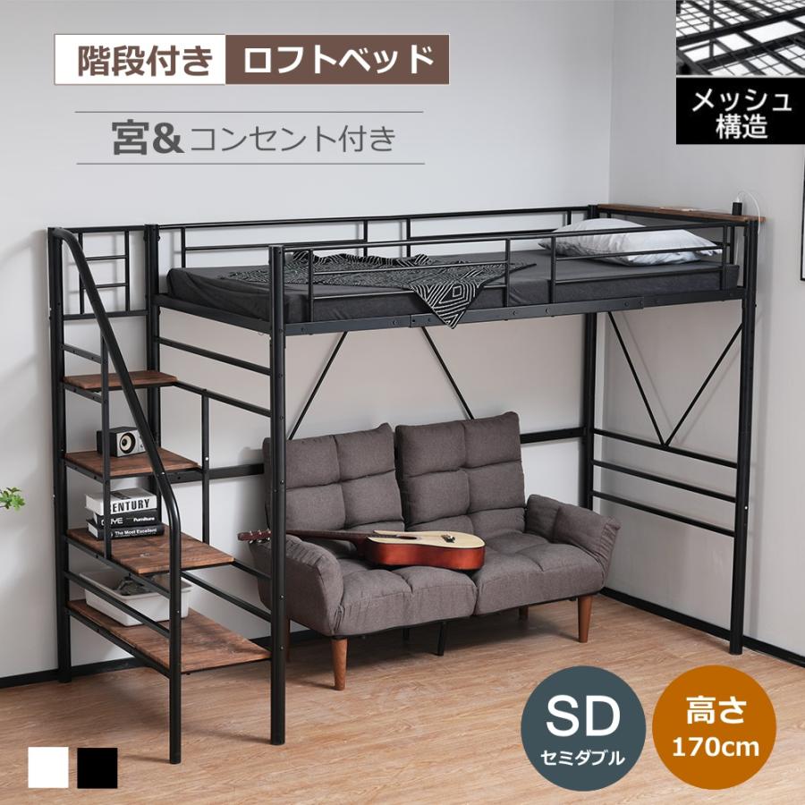 ■ロフトベッド 階段書棚付きロフトベッド ハンガーバー付 スチール パイプベッド 分割可能 階段付き コンセント付き ブラック ホワイト 収