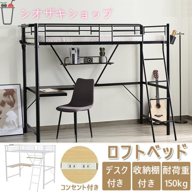 ■ロフトベッド デスク付き パイプベッド システムベット 收納フック付き 耐震ベッド シングル 宮棚コンセント付き ラック棚付き 子供ベ