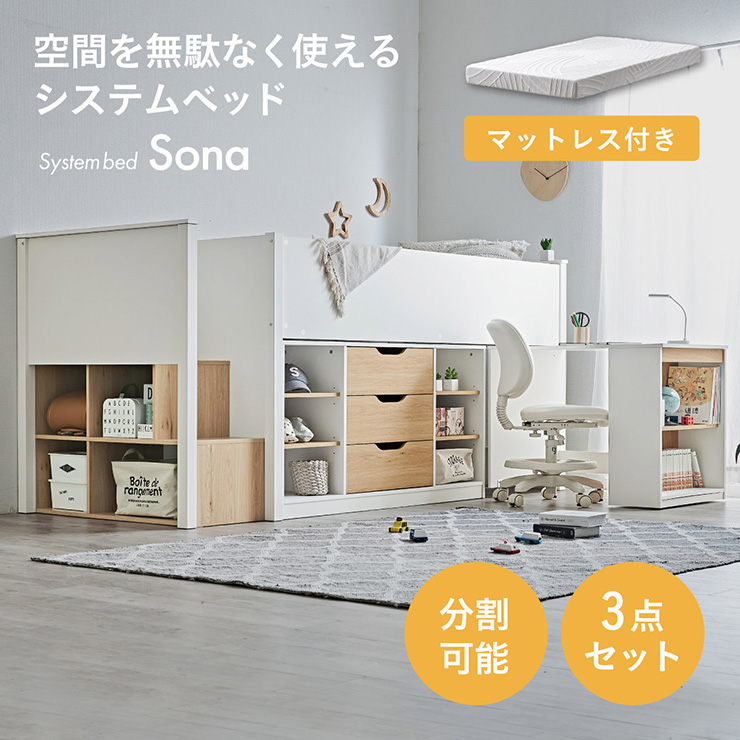 ■システムベッド ロータイプ 中学生 デスク 学習机 大人 マットレス シングル Sona(ソナ) + Unity(ユニティ) ホワイト ロフトベッド 階段