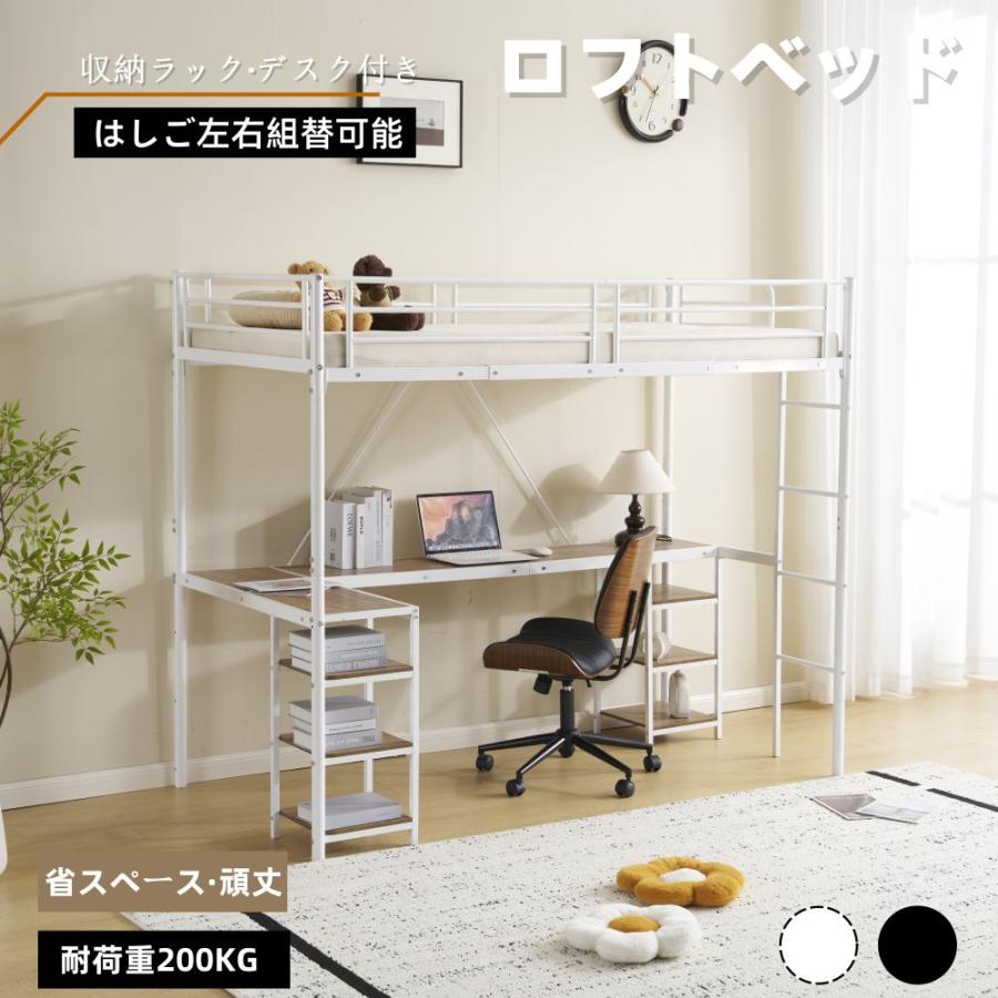 ■ロフトベッド パイプベッド シングル デスク付き 収納棚 ハシゴ付き 左右入れ替え可能 ロフトベッド 収納 大人 一人暮らし 子供ベッド 北