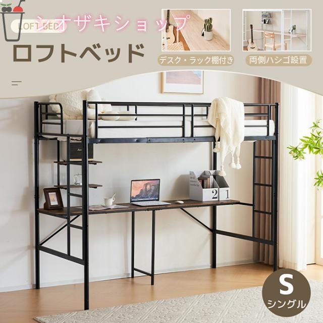 ロフトベッド パイプベッド シングルベッド デスク付き 耐震ベッド 収納棚 階段付き 収納フック 子供ベッド 二段ベッド 子供部屋 パイプ 金属 大人 一人暮らし 北欧風 新生活