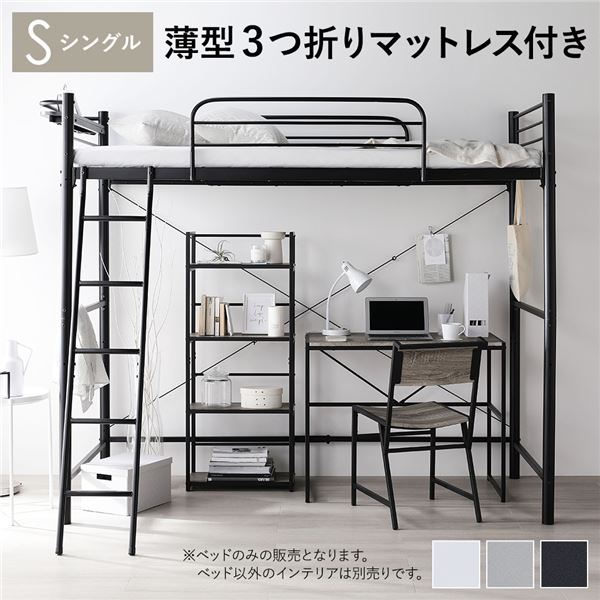 ■ロフトベッド シングル 薄型3つ折りポケットコイルマットレス付き ブラック ベッド スチール 頑丈 宮付き コンセント付 組立品 【北海道