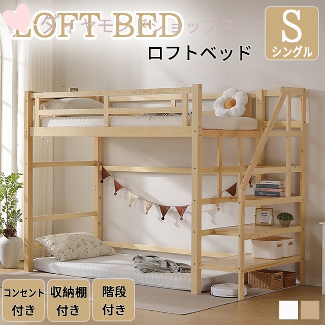 木製 ロフトベッド 天然木 ロフトベッド 階段付き コンセント付き 宮付き 収納棚付き 高さ172cm 二段ベッド シングルベッド 耐震ベッド 大人 子供ベッド 北欧風 一人暮らし 新生活応援