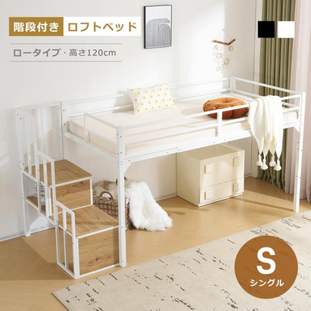 ロフトベッド ロータイプ 階段付き パイプベッド S シングル シングルベッド 木 収納 北欧風 おしゃれ 子供部屋 スチール 子供 一人暮らし
