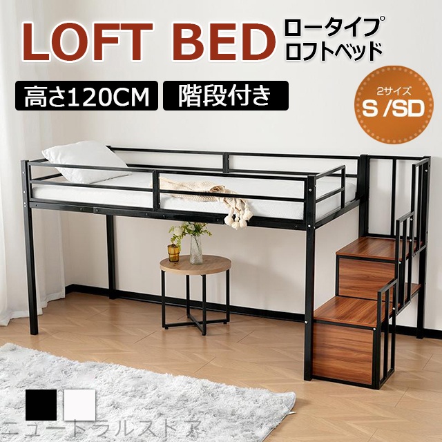 ■ニュ「2サイズ:Sシングル/SDセミダブル」ロータイプ ロフトベッド 高さ120cm 階段付き パイプベッド 耐震ベッド シングルベッド 子供ベ