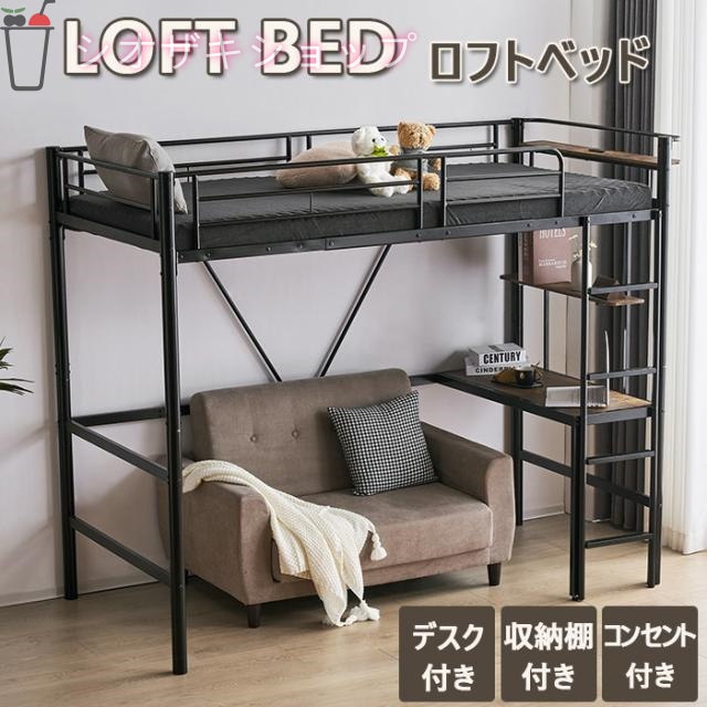 ■ロフトベッド パイプベッド 耐震ベッド シングル デスク付き コンセント付き 耐荷重150kg 収納棚 高さ170cm 子供ベッド 子供部屋