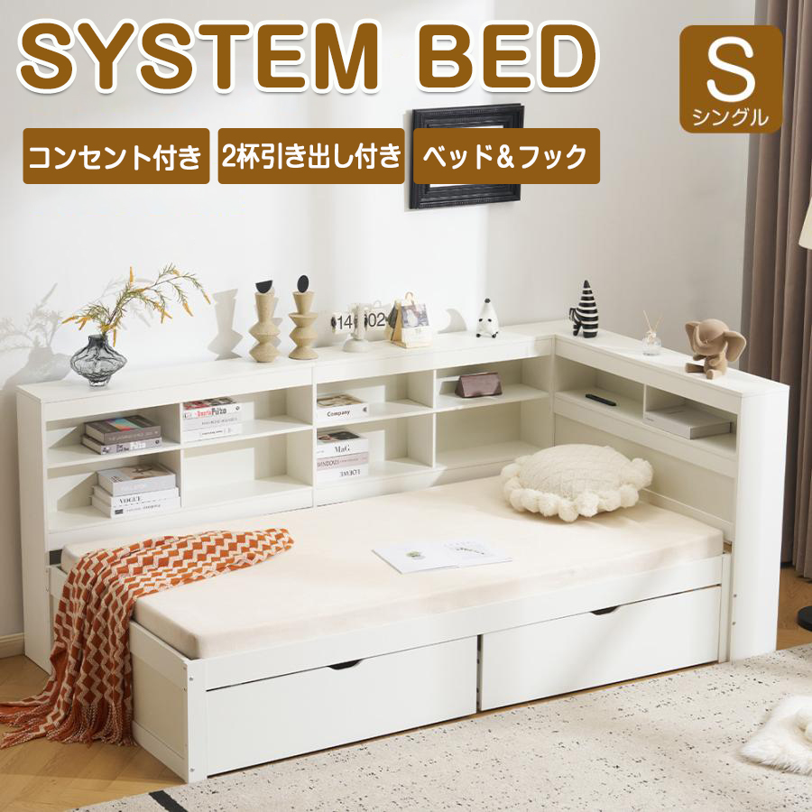 【スペース確報】引き出しをベッド下にしまえば、コンパクトにまとめて空間を有効活用広々【収納重視】お部屋をすっきり ベッド、ラックをコンパクトにまとめたシステムベッド 【シンプルデザイン 全世代に】愛される多機能ベッド永く使えるデザイン、お部屋に与える圧迫感を軽減学生〜シニアまでずっと使える。 【AC&USBポート搭載】4ポート充電ステーション付きACコンセント(2口)+USBポート(2口)。 【大容量の収納スペース】空間の使い方は自由自在。場所を取り勝ちな収納家具をベッドの下に入れたり、お好みのレイアウトを楽しむことができます。宮付き 小物に 収納することができる宮がついていて、メガネや携帯電話などの小物を置くのに便利です。キャスター付き 移動便利スムーズな開閉&静音設計で、マンションでストレスフリー2枚の補強板を採用 【安心して使える 頑丈設計】分厚い板材採用!安心感をもたらします。安全性を向上し、上り下りでも安心。ベッド 耐荷重150kgラック 耐荷重30kg引き出し 耐荷重20kg