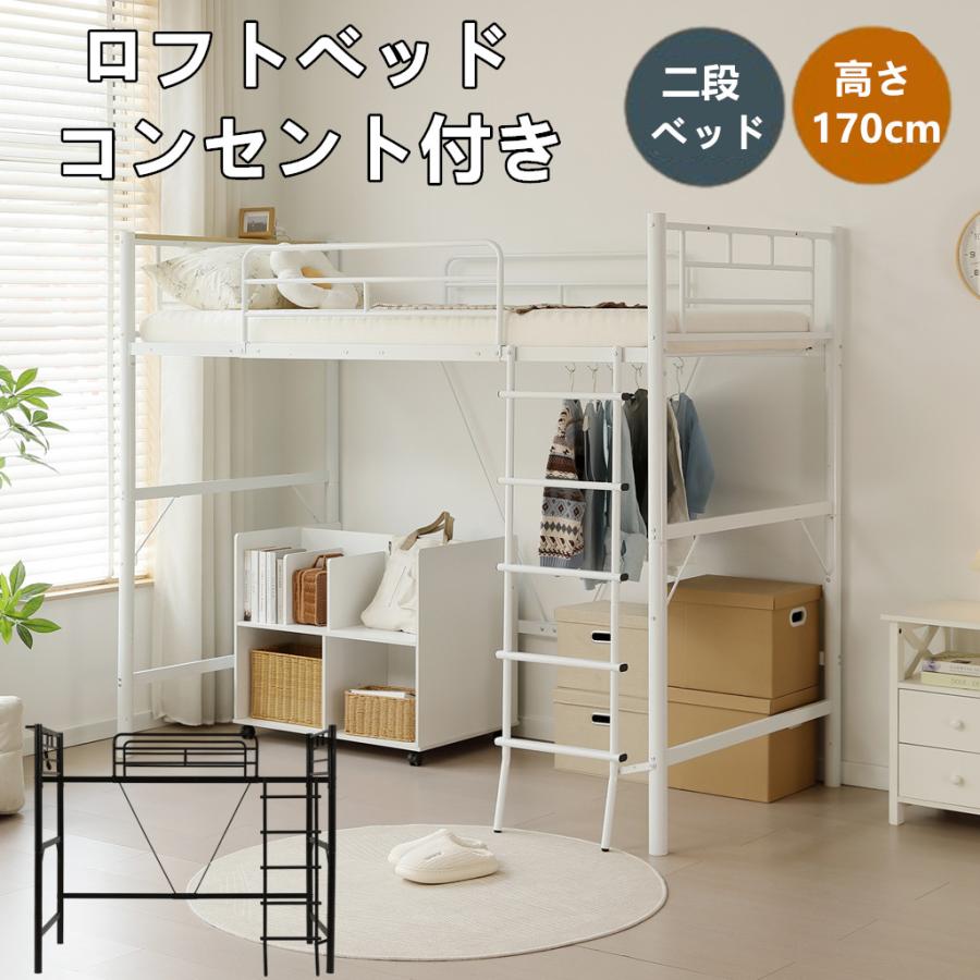 ロフトベッド パイプベッド シングル 高さ170cm コンセント付き 宮 ロフト ベッド 大人用 二段ベッド 子供部屋 子供ベッド スチール 耐震 シングルベッド 寮