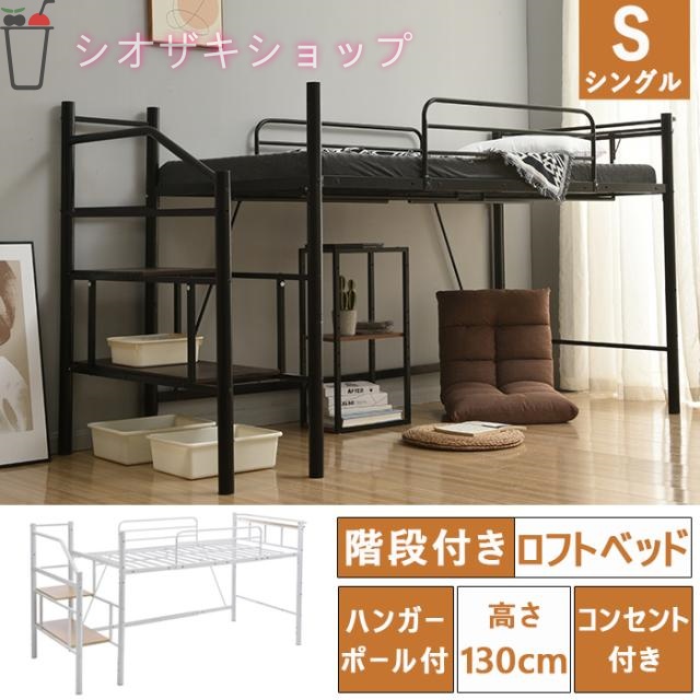 ■「Sシングル 」ロフトベッド パイプベッド シングルベッド 耐震 ベッド コンセント付き 子供ベッド 収納棚付 ロフトベッド段階 二段ベッ