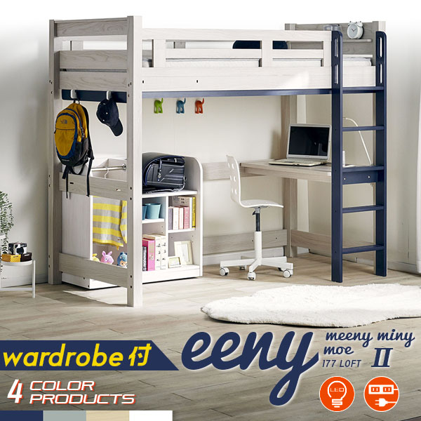 ■【特許構造】ロフトベッド eeny(イーニー) Hi wardrobe H176cm 4色対応 システムベッド 机付き 子供 大人 ハイタイプ デスク 学習机 おし