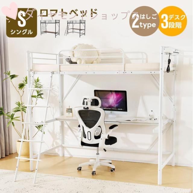 ■ロフトベッド 耐震ベッド パイプベッド デスク付き コンセント付き S シングルベット スチールベッド 階段付き 収納スペース 省スペース