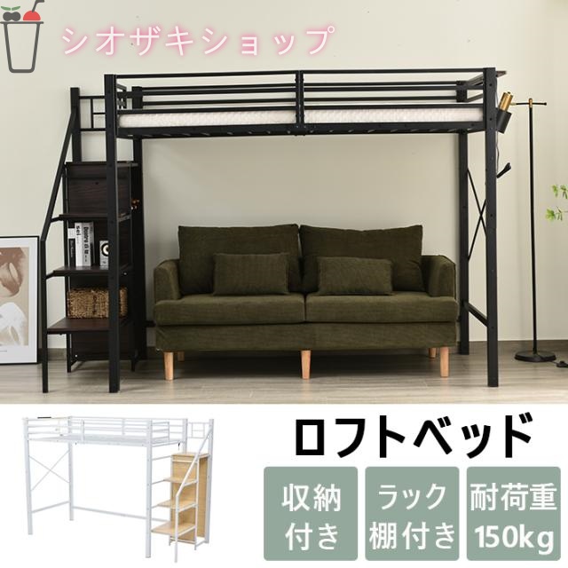 ロフトベッド 階段付き パイプベッド シングル コンセント付き 収納 子供ベッド 子供部屋二段ベッド スチール 耐震 シングル パイプベッド ブラック ホワイト