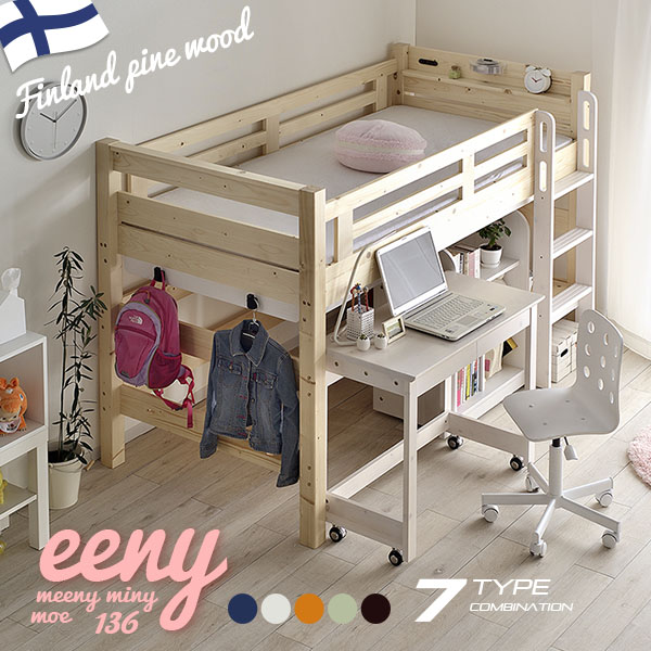 ■【特許構造】宮付き ロフトベッド eeny(イーニー) Low desk+shelf H135cm 4色対応 ロータイプ システムベッド デスク 学習机 学習デスク