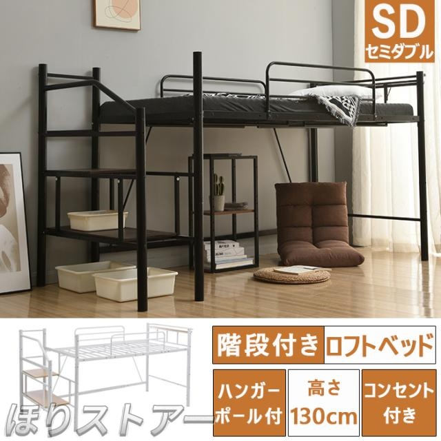 ■ほり「SDセミダブル」 ロフトベッド パイプベッド シングルベッド 耐震 ベッド コンセント付き 子供ベッド 収納棚付 ロフトベッド段階 二