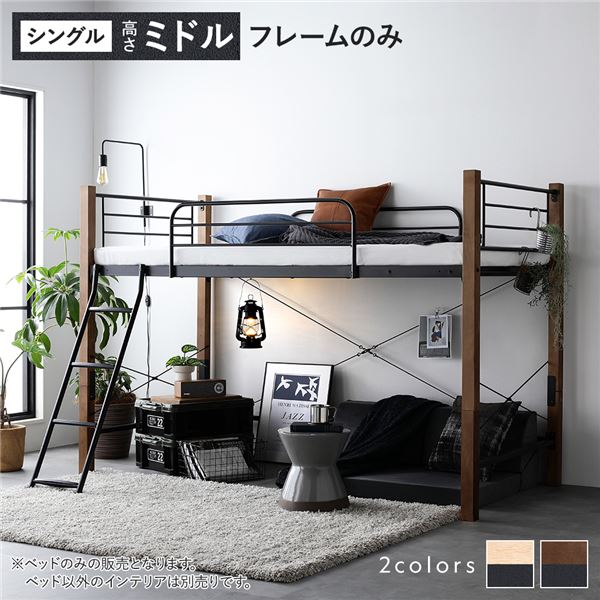 ■ロフトベッド 〔 シングル ミドルタイプ ベッドフレームのみ ブラウン×ブラック 〕 スチール 頑丈 【北海道・沖縄・離島配送不可】