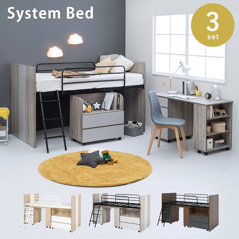 ■システムベッド ロフトベッド 木製 子供 大人 学習机 ロータイプ 子供部屋 ミドル デスク付き 3点セット シングルベッド シングルベット