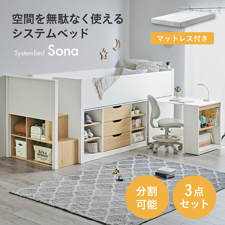 ■システムベッド ロータイプ 中学生 デスク 学習机 大人 マットレス シングル Sona(ソナ) + Unity(ユニティ) ホワイト ロフトベッド 階段