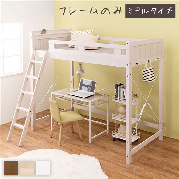 ■ロフトベッド シングル ミドルタイプ ホワイトウォッシュ 床下113cm フレームのみ すのこ仕様 木製 宮付き 2口 コンセント付き 【北海道