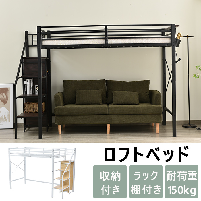 【特別価格!】 ロフトベッド 階段付き S シングル 子供ベッド 片側手すり付き 収納付き パイプベッド シングルベッド 木 北欧風 子供部屋 スチール 耐震 ベッド