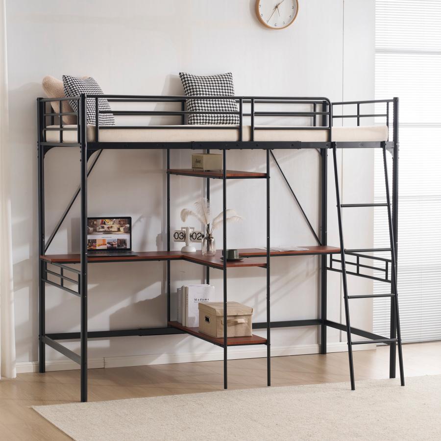 ロフトベッド シングル 収納棚付き 北欧風 木目 子供ベッド 大人ベッド 一人暮らし スチール 耐震 ベッド ブラック デスクラック棚 手すり 頑丈 省スペース