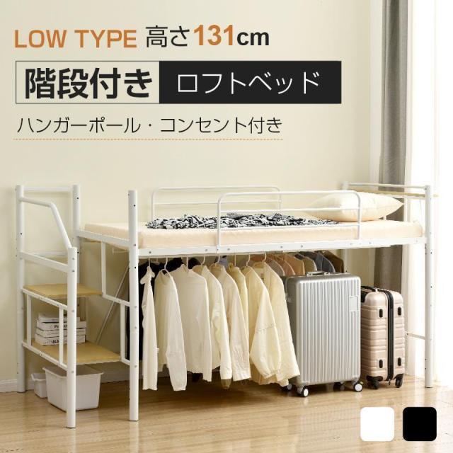 ■ロフトベッド ロータイプロフトベッド システムベッド パイプベッド ミドルタイプ ハンガーポール4本付属 耐震ベッド シングルベッド コ