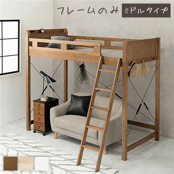 ■ロフトベッド シングル ミドルタイプ ミドルブラウン 床下113cm ベッドフレームのみ すのこ仕様 木製 宮付き 2口 コンセント付き 【北海