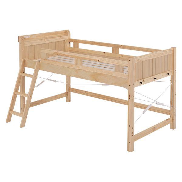 ■商品説明 ●ベッド下にチェストや収納ケースなど置き場に困る物をまとめて収納ができます。 ●天然木のパイン材を贅沢に使用。自然の木の香りを感じられる美しい風合いと経年による変化も楽しめます。 ●耐荷重350kgの安定感、寝台を支える4本の太柱が荷重をしっかり支える頑丈設計。 ●すのこを支える桟木の数を従来より多くすることで強度の増す構造にしました。 ●すのこ間隔を狭くすることで、お手持ちの布団を使えるようにしました。マットレスを買わずに使えるので経済的です。 ●布団の落下や寝ている時の落下を防ぐ、少し高めの4方向フレームを採用。 ●お部屋に合わせて、4方向にハシゴを自由な位置に変えられます。 ●コンセント付きの便利な宮棚と小物を引掛けるサイドフック付き。丈の長い洋服もかけられます。 ※ベッドの上で飛び跳ねたり、一部に集中した不可がかかると耐荷重よりも少ない荷重で割れや破損する場合がございます。 ■商品詳細 カラー:ライトブラウン/ナチュラル/ホワイトウォッシュ サイズ(約):幅106×奥行210×高さ122×床面高82.5cm 素材:主材:天然木(パイン材) 組立:お客様組み立て式