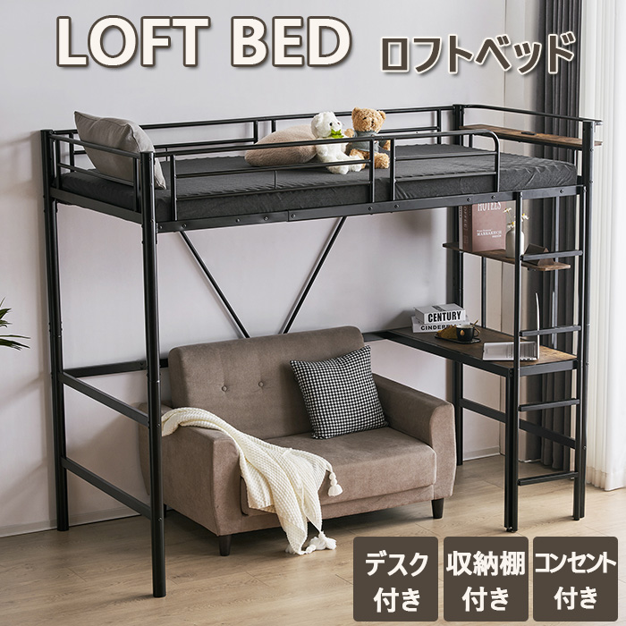 ■ロフトベッド シングル 収納棚付き 北欧風 木目 子供ベッド 大人ベッド 一人暮らし スチール 耐震 ベッド ブラック デスクラック棚 手す