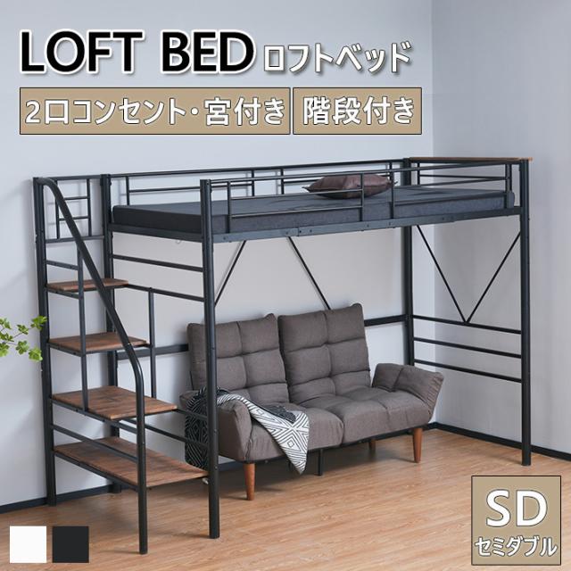ふぃ SD ロフトベッド 階段付き パイプベッド 耐震ベッド セミダブルベッド 宮・コンセント付き 子供ベッド 二段ベッド 収納付き 子供部屋二段ベッド パイプベッドフレーム スチール 新生活応援