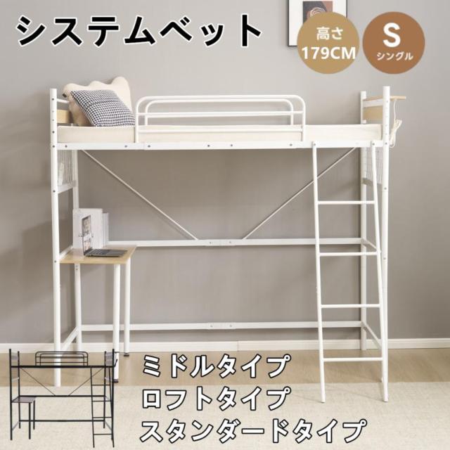 システムベット ロフトベッド シングル 3WAY 収納付き デスク付き コンセント付き メッシュパネル付き 高さ3段階 北欧風 スチール 耐震 一人暮らし ロフトベッド
