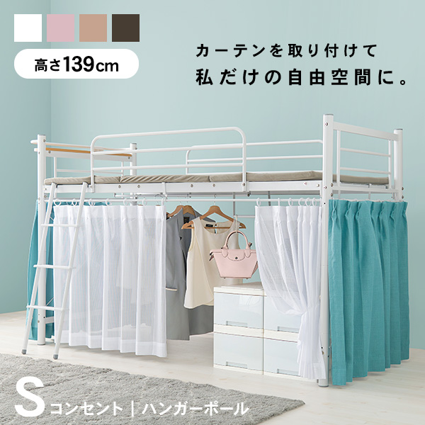 お好きなカーテンが取り付けられる高機能ロフトベッド「AQUA」正面とサイドにカーテンレール&リングが付いているので、急な来客時など、ベッド下をサッと隠したい時に大活躍。こちらは【ベッドフレーム単品販売】なので、ぜひ気に入ったカーテンを見つけて取り付けてみてください!付属品としてハンガーポールが4本付いているので、ベッド下にコートやスカート、バッグや小物を掛けてウォークインクローゼット風にすることも。さらに宮棚には1500Wまで使える2口コンセント付きなので、寝ながらスマートフォンやタブレットの充電をすることもできます。【商品サイズ(約)】■ロフトベッド時:幅97×奥行220×高さ139cm(床板高さ:106cm)■シングルベッド時:幅97×奥行220×高さ77.5cm(床板高さ:44cm)【対応マットレスサイズ(約)】幅92×高さ198cmまで【梱包サイズ・梱包重量(約)】(1)幅95×奥行37.5×高さ16cm(13kg)(2)幅91×奥行72×高さ11cm(20kg)(3)幅122×奥行39×高さ14cm(22kg)【材質】スチール【生産国】中国【備考】カーテンは別売りです