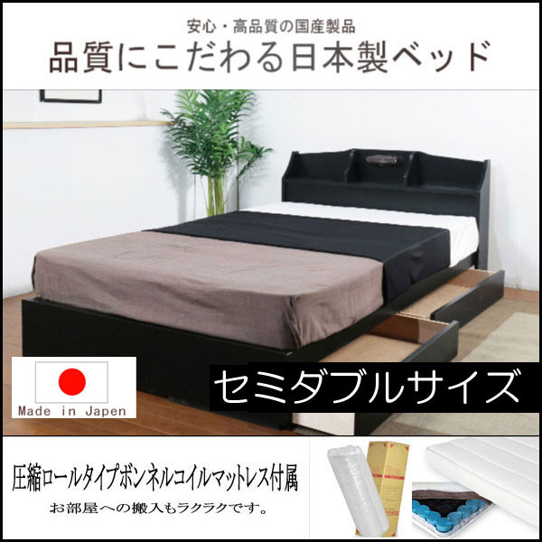 ■ベッド ベッドマットレス付き セミダブル 送料無料 棚 照明 コンセント 引き出し付き デザインベッド マットレス付き セミダブルサイズ K