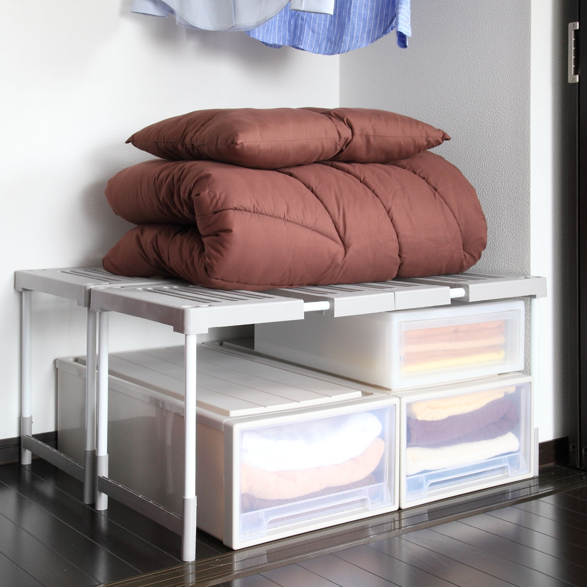 送料無料 日本製[整理棚][大掃除][押入れ収納棚][クローゼット収納][押入れ整理][収納術][押入れ収納ラック][整頓][高さ調節][横伸縮][倉庫][プラ][プラスチック][毛布]