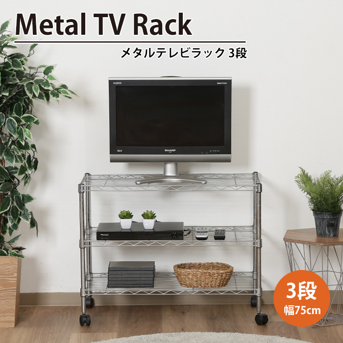 メタルテイストのスチール製TV台です。自由度の高いメタルラックのため、天板をお好みの高さに調整できます。パソコン周辺の整理棚としても使えます。 キャスターとアジャスターを選んでお使いいただけます。キーワード: スチールラック 3段 キャスター付き 幅75 奥行35 高さ58 スリム 棚 収納 テレビ台 TVラック ローボード TV台 オープンラック シェルフ ラック シンプル おしゃれ メタルラック テレビボード 事務所 キッチン 洗面台 玄関 省スペース 本棚 一人暮らし 新生活 クロムメッキ インテリアラック 家庭用 家具 収納家具 メタルシェルフ 三段 幅75cm コンパクト キャスター お洒落 台所 引越し テレビラック 錆予防 家庭用 収納棚 倉庫 クロームメッキ スチール棚 スチールシェルフ